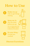 Spray three times into the bowl before you take a seat (or more if you’ve been saving up). Our formula floats on top of the water and forms a protective barrier that locks in the stink where it belongs. Every ingredient used is toilet-safe, so you can confidently use it everywhere you go: home, at the doctors office, in a hotel or RV! Flush it down, wave goodbye, and let your favorite Discreet Excretions scent do the rest!